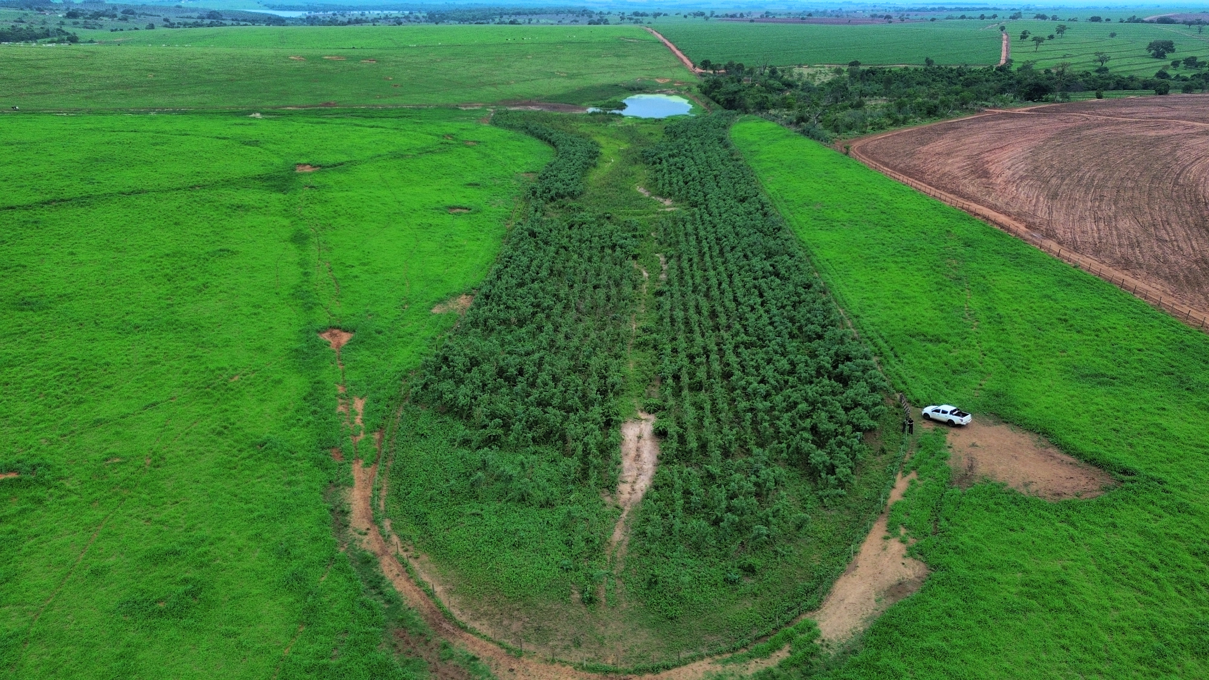 O plantio de 13 hectares foi conduzido entre os dias 18 de novembro de 2025 a 14 de janeiro de 2026, sendo realizado a semeadura em linhas com espaçamento a cada 1,5 metros. A execução do plantio foi em linhas com as seguintes etapas: roçada inicial, com objetivo de diminuir a biomassa; aplicação de herbicida Glifosato e pré-emergente indaziflam direcionado nas touceiras de capim; Canterizador para preparo das linhas; semeadura de forma manual contínua nas linhas no espaçamento de 1,5m.